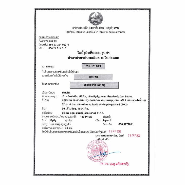 LuciEna is an isocitrate dehydrogenase-2 inhibitor indicated for the treatment of adult patients with relapsed or refractory acute myeloid leukemia (AML) with an isocitrate dehydrogenase-2 (IDH2) mutation.