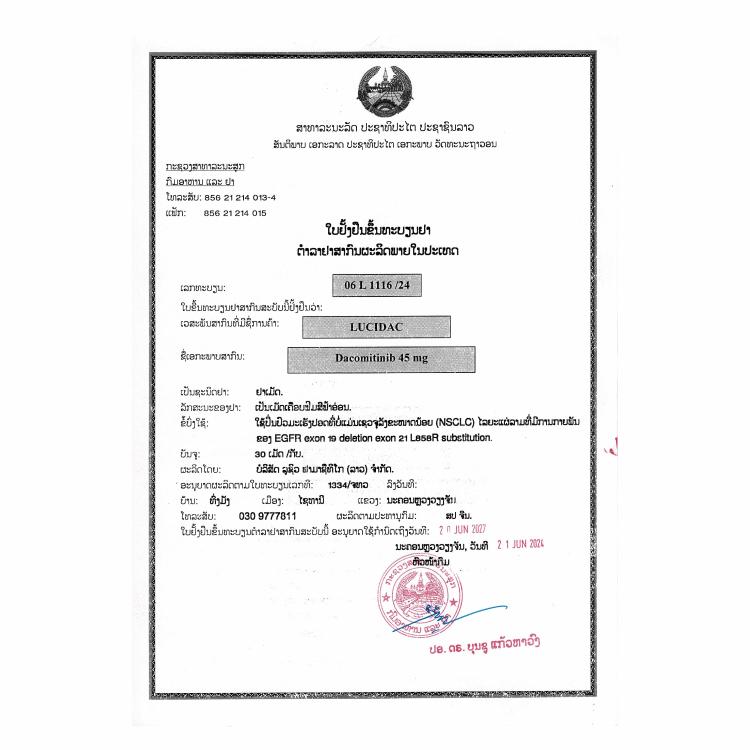 LuciDac is a kinase inhibitor indicated for the first-line treatment of patients with metastatic non-small cell lung cancer (NSCLC) with epidermal growth factor receptor (EGFR) exon 19 deletion or exon 21 L858R substitution mutations as detected by an FDA-approved test.